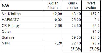 MPH Health Care has 4.28 million shares. At a share price of € 22.4, the total market capitalization of MPH Health Care is only € 95.9 million. That is 37.8% of the NAV / net asset value.